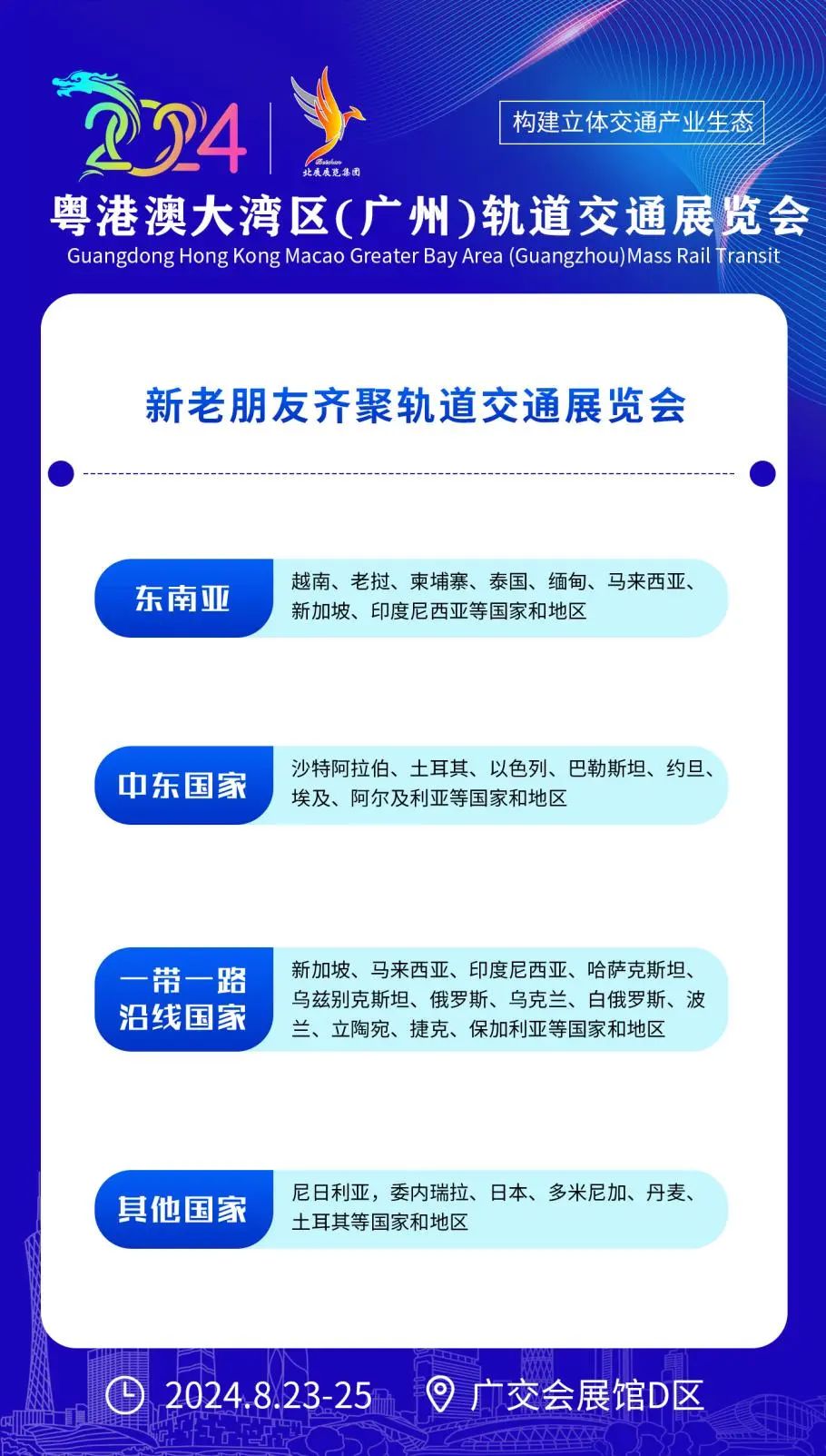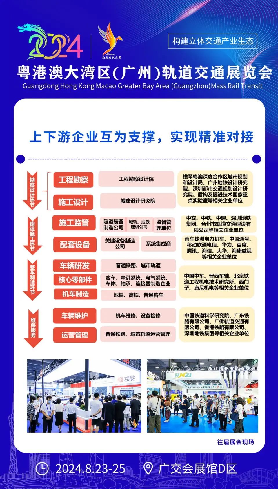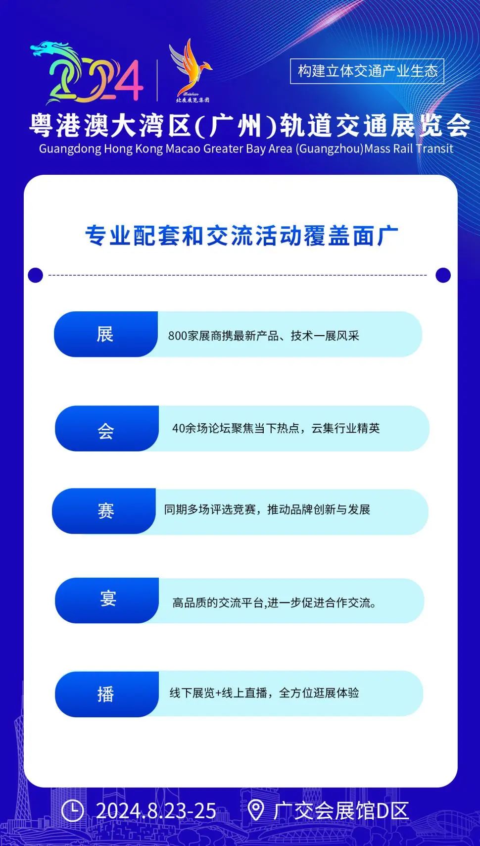 2024年8月23-25日,2024粵港澳大灣區(qū)(廣州)軌道交通展覽會將在廣州·廣交會展館D區(qū)舉行。本屆展覽會以“匯聚新動能·共建新生態(tài)”為主題,將舉辦開幕式暨主題論壇、綜合展覽,專業(yè)賽事、成果發(fā)布、成果評選、產(chǎn)業(yè)對接等一系列形式多樣的活動。